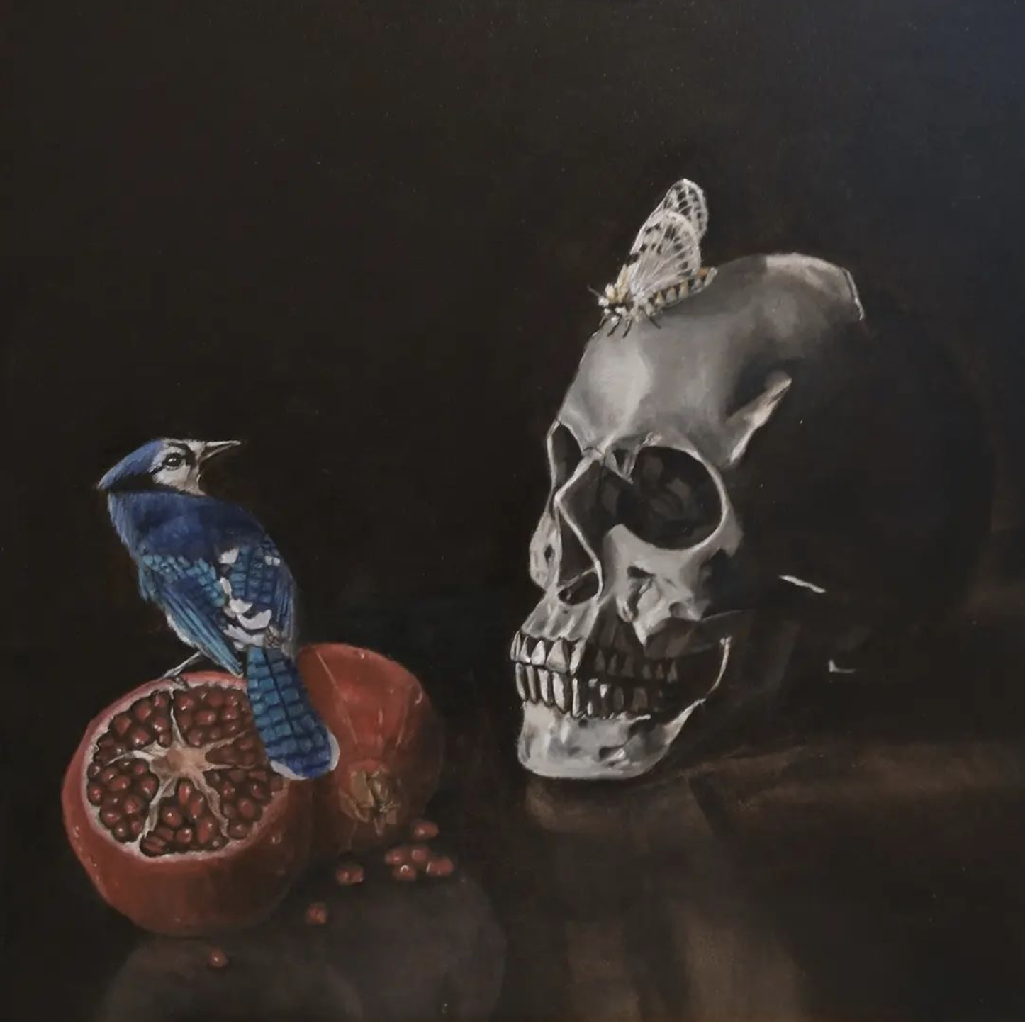 “Can you paint me a skull painting?” I sure can! I’m very much into memento mori paintings, so this was a dreamy request for me! These paintings are often symbolistic, and as the latin name states, reminders of inevitability of death. I wanted to paint death as part of life, part of a cycle, or circle. I made a draft of the painting, which I then after acceptance painted. No further edits were requested, so I finished the painting, and delivered readily varnished! Varnishing is included in the prices, but can only be done after 6 months drying time. It sure makes the colors much more vibrant, especially in dark paintings like this one!